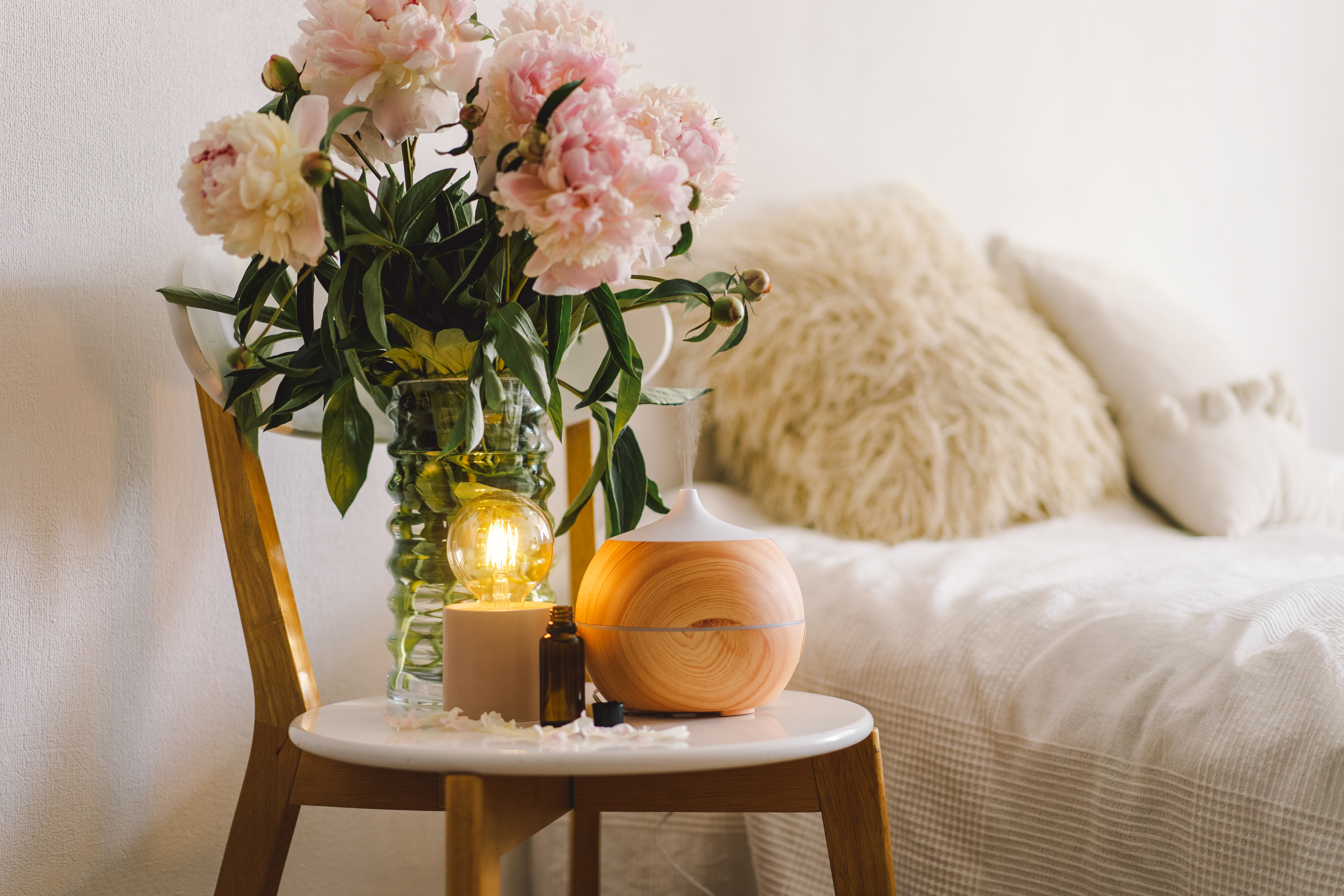 Aroma oil diffuser on chair against in the bedroom. Air freshener. Photo Credit: Envato @StiahailoAnastasiia